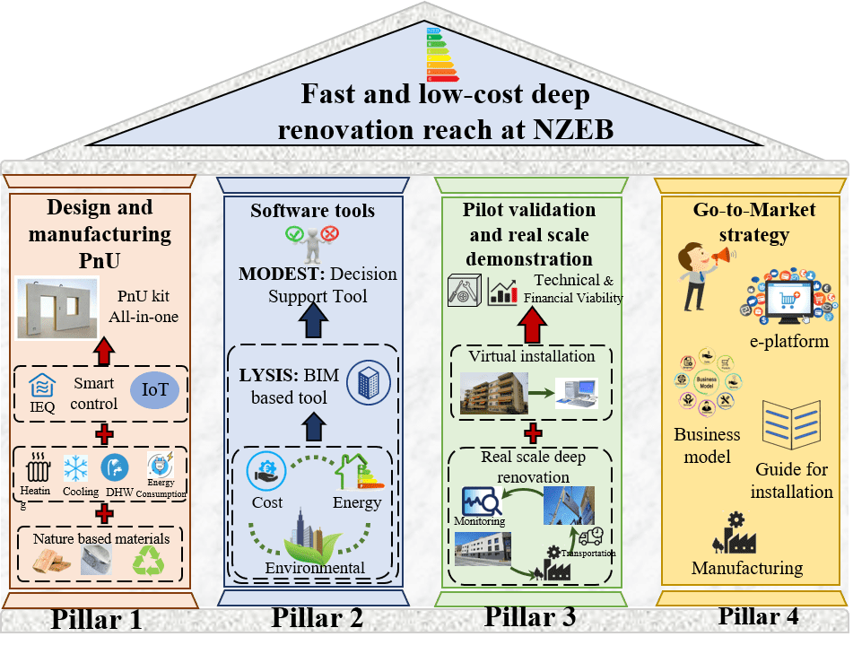 El proyecto PLURAL tiene como objetivo diseñar, validar y demostrar una gama de kits plug-and-use versátiles, adaptables, escalables y prefabricados of-sitte. Se desarrollará una plataforma basada en Building Information Modeling (BIM) y una herramienta de soporte de decisiones (DST) para permitir la selección e integración óptimas de componentes, el mejor diseño de kit Plug-and-Use, fabricación e instalación más rápidas y de bajo costo. Los sistemas de control inteligente se combinarán con componentes de fachadas prefabricadas de bajo impacto ambiental para crear los kits integrados todo en uno Plug-and-Use para la renovación profunda de edificios residenciales. El proyecto tiene como objetivo crear ejemplos de renovación de mejores prácticas para el sector residencial basados en la innovación y la competitividad, con beneficios para los ciudadanos y el medio ambiente; desarrollar herramientas de formación para las principales partes interesadas (planificadores, instaladores, propietarios de edificios y usuarios finales); para mejorar los estándares de desempeño basados en el ciclo de vida (LCA, LCC) aplicados en el sector de la construcción.
